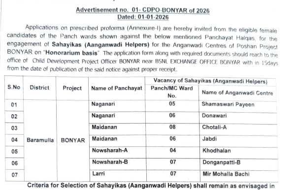 The Child Development Project Officer (CDPO), POSHAN Project Boniyar, under the Social Welfare Department, Government of Jammu and Kashmir, has released an official notification inviting applications for the recruitment of Sahayikas (Anganwadi Helpers) in various Anganwadi Centres (AWCs) of POSHAN Project Boniyar, District Baramulla.