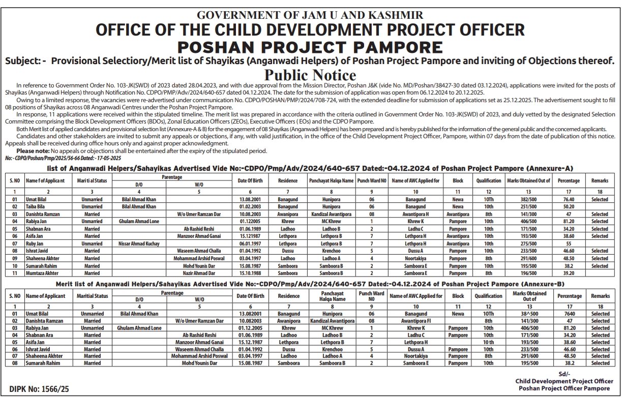 The Child Development Project Officer (CDPO), Pampore, has officially released the provisional selection/merit list for the post of Shayikas (Anganwadi Helpers) under the Poshan Project Pampore 2025. The notification, dated 17-05-2025, announces the selection of candidates based on the merit of applications received following Government Order No. 103-JK(SWD) of 2023.