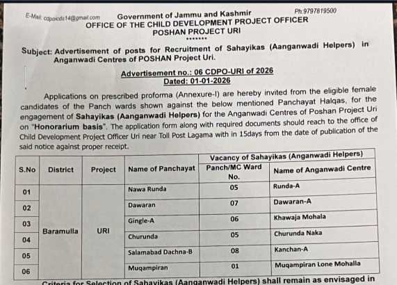 This recruitment is an excellent opportunity for local women candidates from Panchayat wards of Uri to serve in the Integrated Child Development Services (ICDS) under POSHAN Abhiyaan on an honorarium basis.