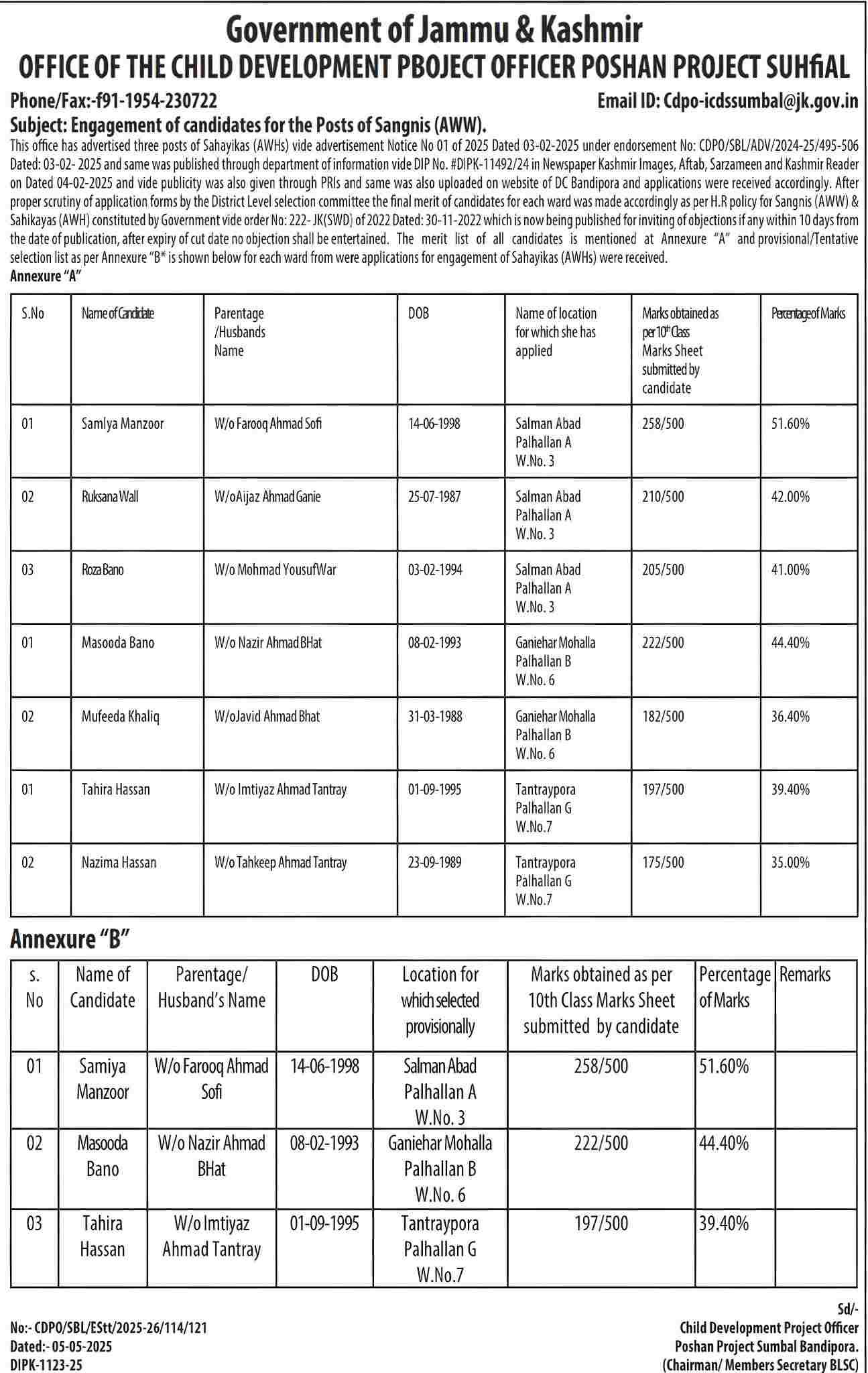 For more details or to raise objections, candidates can reach out to the Child Development Project Officer, Poshan Project Sumbal, at cdpo-icdssumbal@jk.gov.in.