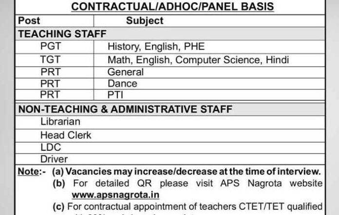 Army Public School (APS) Nagrota has announced vacancies for the academic session 2025-26 on a contractual/adhoc/panel basis. The school is seeking qualified teaching and non-teaching staff through Local Selection Board (LSB) interviews.