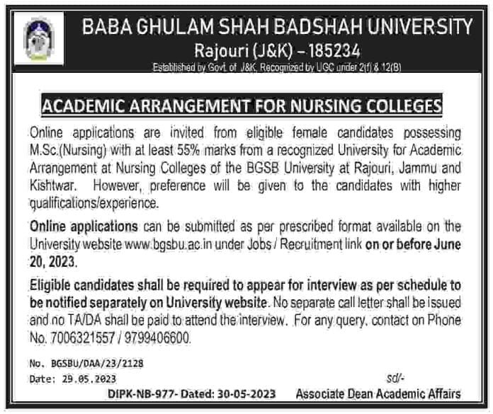 Online applications are invited from eligible female candidates possessing M.Sc.(Nursing) with at least 55% marks from a recognized University for Academic Arrangement at Nursing Colleges of the BGSB University at Rajouri, Jammu and Kishtwar. However, preference will be given to the candidates with higher qualifications/ experience.