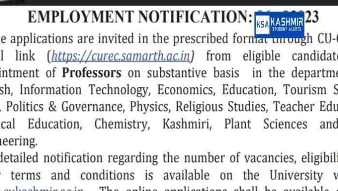 portal link (https://curec.samarth.ac.in) from eligible candidates for appointment of Professors on substantive basis in the departments of English, Information Technology, Economics, Education, Tourism Studies, Urdu, Politics & Governance, Physics, Religious Studies, Teacher Education, Physical Education, Chemistry, Kashmiri, Plant Sciences and Civil Engineering.