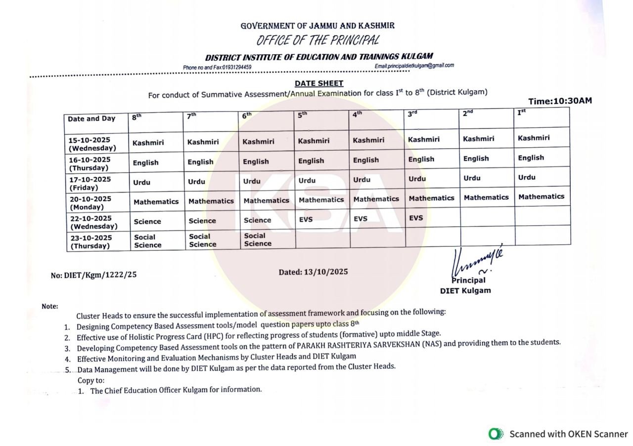 The District Institute of Education and Trainings (DIET) Kulgam, under the Government of Jammu and Kashmir, has officially released the Date Sheet for the Summative Assessment/Annual Examination 2025 for Classes 1st to 8th. According to the official notification (No: DIET/Kgm/1222/25), the examinations across all government and recognized private schools in the Kulgam district will begin from October 15, 2025, and conclude on October 23, 2025.