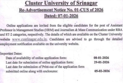 The Cluster University of Srinagar (CUS) has issued a re-advertisement notification inviting online applications from eligible candidates for the post of Assistant Professor in selected disciplines. The recruitment is being conducted under Re-Advertisement Notice No. 01-CUS of 2026, dated 07 January 2026.