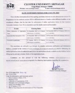Srinagar, January 25, 2024: Cluster University Srinagar has extended the last date for submission of online application forms for the Common University Entrance Test-Postgraduate (CUET-PG) 2024. The revised schedule is as follows:
