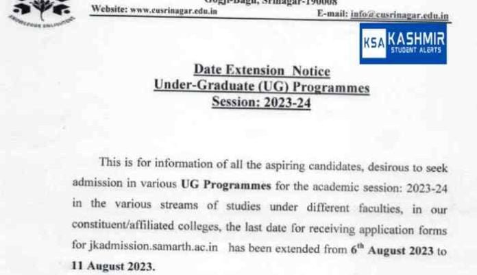 This is for information of all the aspiring candidates, desirous to seek admission in various UG Programmes for the academic session: 2023-24 in the various streams of studies under different faculties, in our constituent/ affiliated colleges, the last date for receiving application forms for jkadmission.samarth.ac.in has been extended from 6th August 2023 to 11 August 2023.