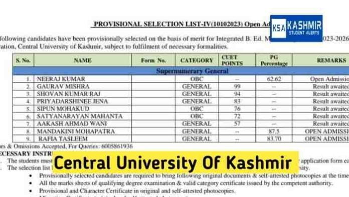 CUK Provisionally selected on the basis of merit for Integrated B.Ed. M.Ed Programme (2023-2026)