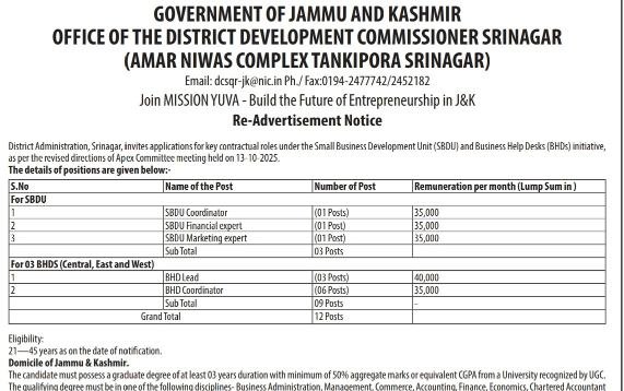 The Office of the District Development Commissioner Srinagar has issued a re-advertisement notice inviting applications for several key contractual positions under the Small Business Development Unit (SBDU) and Business Help Desks (BHDs) as part of MISSION YUVA – Build the Future of Entrepreneurship in J&K. Candidates from Jammu & Kashmir with the required qualifications and passion for entrepreneurship development are encouraged to apply.