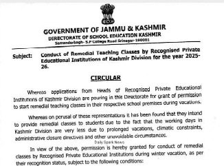 The Directorate of School Education Kashmir’s decision to allow remedial classes during winter vacation is a positive step aimed at supporting students academically while ensuring their safety and rights. With clear instructions on parental consent, no-fee policy, heating arrangements, and regulated timings, the circular ensures that learning support continues in a responsible and student-friendly manner.