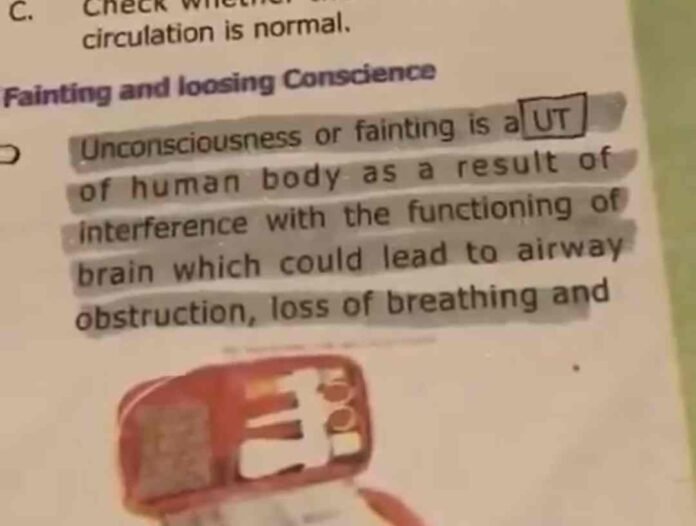 Public outcry erupted after a social media user posted a video on X showing a JKBOSE Class 5 Economics textbook, Disaster Management and Road Safety Education, containing a misprinted sentence: “Unconsciousness or fainting is a UT of Human body.” The correct sentence should have been: “State of Human Body.”