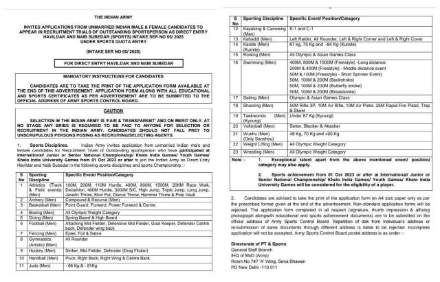 LSI Keywords: Army sports quota 2025, Havildar sports quota Indian Army, Naib Subedar sports quota Army, Indian Army sports recruitment intake 05/2025, apply for Army sports quota 2025