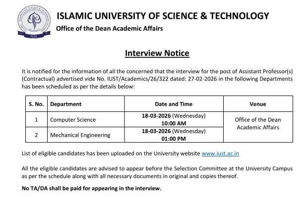 The Islamic University of Science and Technology has released an official interview notice for the post of Assistant Professor (Contractual) under the Office of the Dean Academic Affairs.