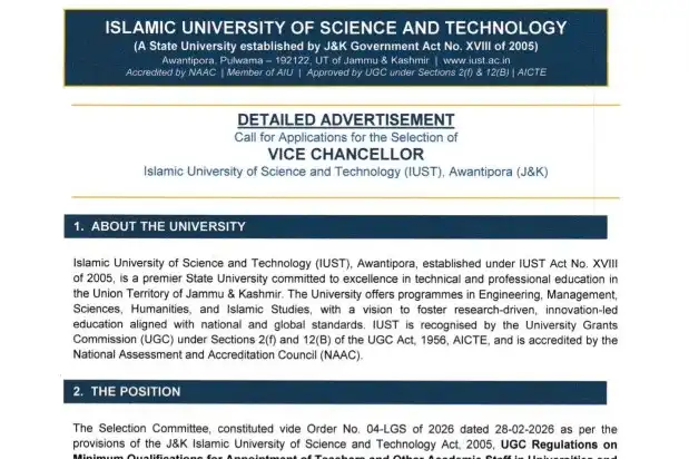 The selection committee constituted under government orders has invited applications and nominations from distinguished academicians for the post of Vice Chancellor. The recruitment is governed by UGC Regulations, 2018, along with provisions of the IUST Act, 2005.