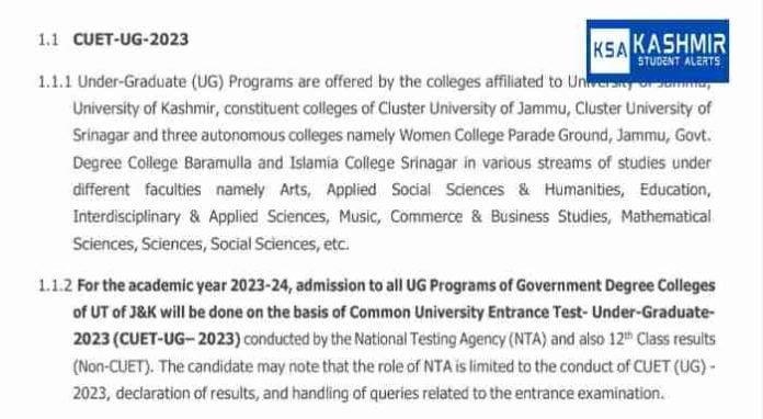 1.1.2 For the academic year 2023-24, admission to all UG Programs of Government Degree Colleges of UT of J&K will be done on the basis of Common University Entrance Test- Under-Graduate-2023 (CUET-UG– 2023) conducted by the National Testing Agency (NTA) and also 12th Class results (Non-CUET). The candidate may note that the role of NTA is limited to the conduct of CUET (UG) – 2023, declaration of results, and handling of queries related to the entrance examination.