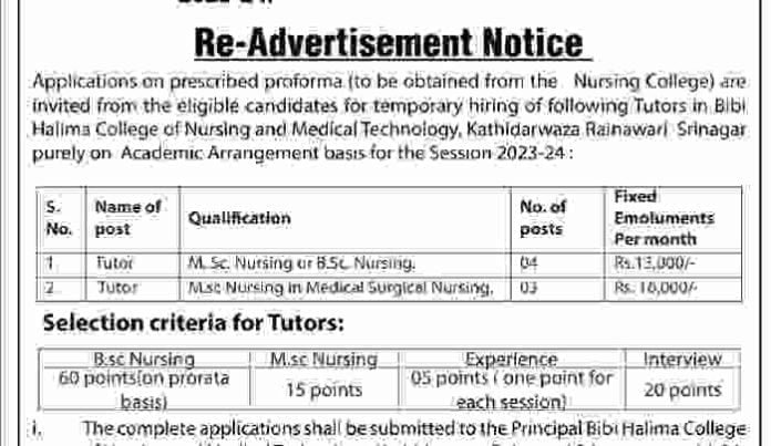 Engagement of Tutors in Bibi Halima College of Nursing and Medical Technology Kathidarwaza Rainawari, Srinagar on Academic Arrangement for the Session 2023-24.