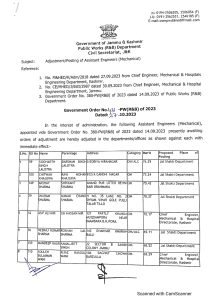 In the interest of administration, the following Assistant Engineers (Mechanical), appointed vide Government Order No. 380-PW(R&B) of 2023 dated 14.09.2023 presently awaiting orders of adjustment are hereby adjusted in the departments/offices as shown against each with immediate effect: