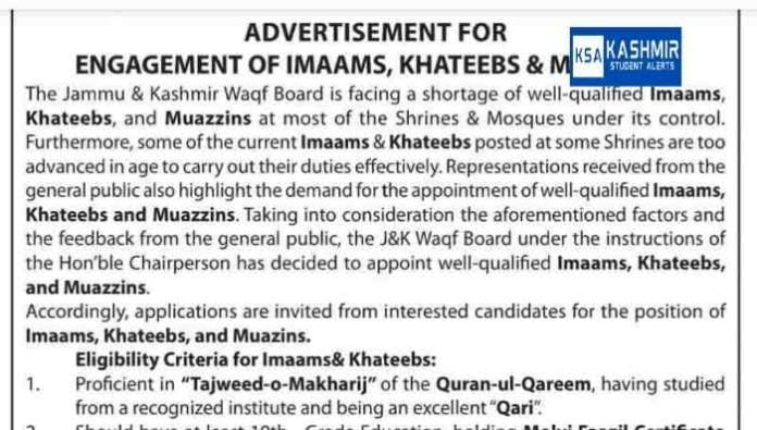 J&K ADVERTISEMENT FOR ENGAGEMENT OF IMAAMS, KHATEEBS & MUAZZINS