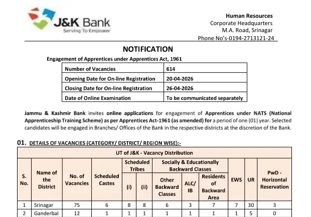 The Jammu & Kashmir Bank (J&K Bank) has officially released the Apprenticeship Recruitment Notification 2026–27, inviting online applications for 614 Apprentice posts under the Apprentices Act, 1961. This recruitment offers a valuable opportunity for fresh graduates to gain hands-on banking experience through the National Apprenticeship Training Scheme (NATS).