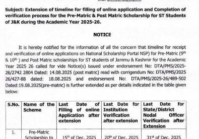Jammu, Dec 01, 2025: The Government of Jammu and Kashmir, Directorate of Tribal Affairs, has issued a significant update regarding the application timeline for Pre-Matric and Post-Matric Scholarships meant for Scheduled Tribe (ST) students of Jammu & Kashmir for the Academic Year 2025-26. As per the fresh notice, the deadline for online application and verification on the National Scholarship Portal (NSP) has been extended to allow more students to complete the process without any inconvenience.