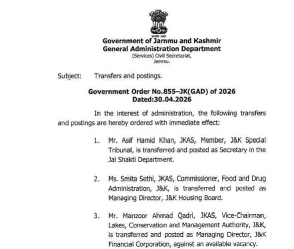 The Government of Jammu & Kashmir has carried out a major administrative reshuffle involving 179 officers across various departments, marking one of the largest bureaucratic changes in recent times. The reshuffle, issued by the General Administration Department (GAD), reflects the administration’s continued efforts to streamline governance, improve efficiency, and ensure effective implementation of policies across the Union Territory.