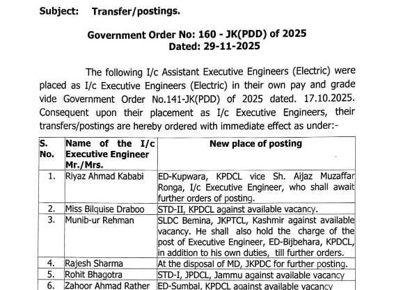 The Power Development Department, Jammu & Kashmir (PDD) on 29 November 2025 issued a fresh round of transfers and postings of officers, following their elevation to In-charge (I/c) Executive Engineers (Electric). The order is issued via Government Order 160‑JK(PDD) of 2025, succeeding an earlier placement under Government Order 141‑JK(PDD) of 2025 dated 17 October 2025.