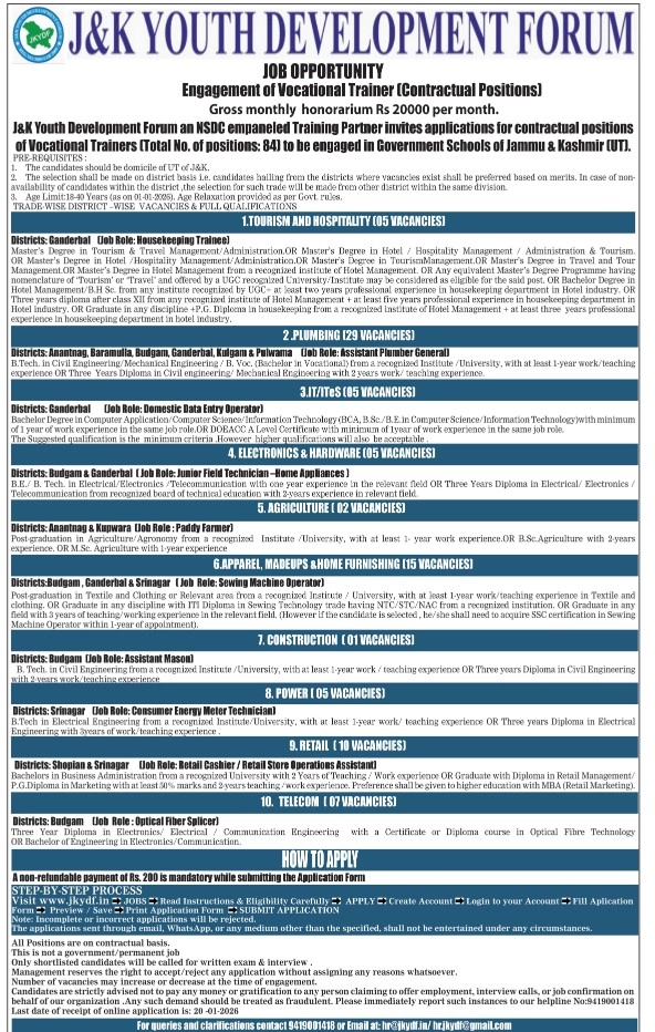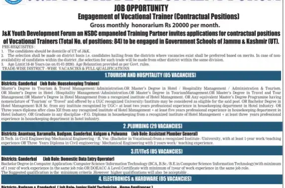 This recruitment offers an excellent opportunity for qualified professionals to work in the education and skill development sector while contributing to the growth of vocational training in Jammu & Kashmir.