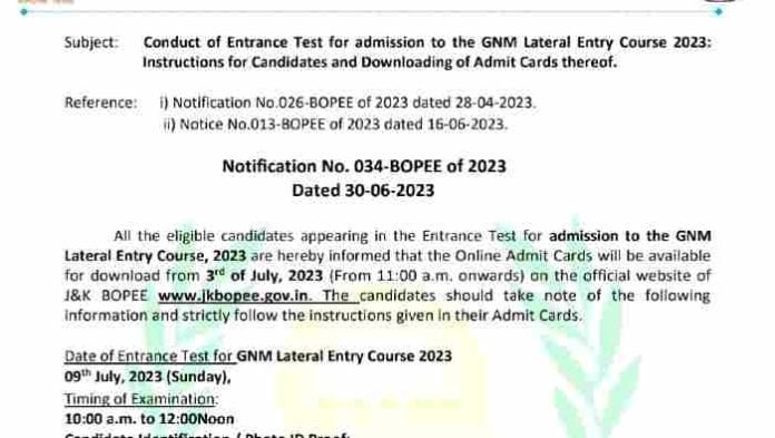 Lateral Entry Course, 2023 are hereby informed that the Online Admit Cards will be available for download from 3rd of July, 2023 (From 11:00 a.m. onwards) on the official website of J&K BOPEE www.jkbopee.gov.in. The candidates should take note of the following information and strictly follow the instructions given in their Admit Cards.