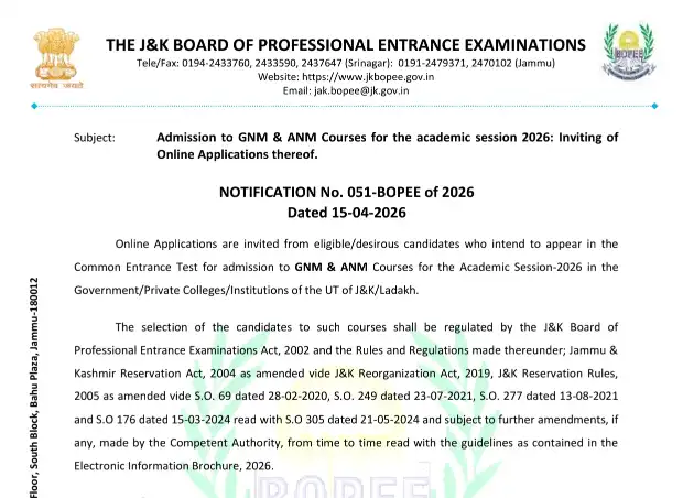 As per Notification No. 051-BOPEE of 2026 dated 15-04-2026, online applications are invited from eligible candidates for admission to GNM and ANM courses in government and private institutions across J&K and Ladakh.