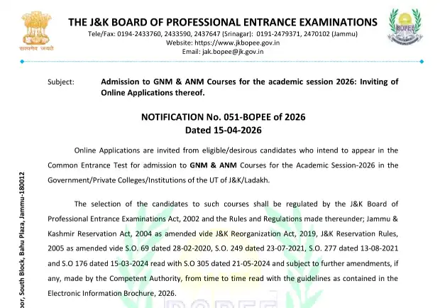 The Jammu and Kashmir Board of Professional Entrance Examinations (JKBOPEE) has officially released the notification for GNM (General Nursing and Midwifery) and ANM (Auxiliary Nursing Midwifery) courses for the academic session 2026. Candidates aspiring to build a career in the healthcare sector can now apply online through the official BOPEE portal.