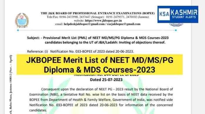 JKBOPEE Merit List of NEET MD/MS/PG Diploma & MDS Courses-2023