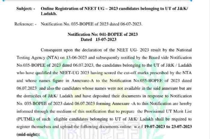 who have qualified the NEET-UG 2023 having scored the cut-off marks prescribed by the NTA and whose names figure in Annexure-A to the Notification No.035-BOPEE of 2023 dated 06.07.2023 and also the candidates whose names were not available in the said annexure but are the domiciles of J&K/ Ladakh and have deposited their documents in response to Notification No. 035-BOPEE of 2023 dated 06.07.2023 forming Annexure -A to this Notification are hereby informed through the medium of this notification that to prepare the Provisional UT Merit List (PUTML) of such eligible candidates belonging to UT of J&K/ Ladakh shall be required to register themselves and upload the following documents online w.e.f 19-07-2023 to 23-07-2023 (mid-night):