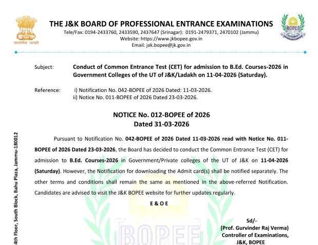 The Jammu & Kashmir Board of Professional Entrance Examinations (JKBOPEE) has officially announced the conduct of the Common Entrance Test (CET) for B.Ed. Courses-2026. As per the latest notification, the entrance exam will be held on April 11, 2026 (Saturday) for admission to B.Ed. programmes in Government and Private Colleges across the Union Territories of J&K and Ladakh.