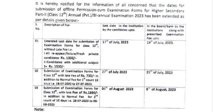 concerned that the dates for submission of offline Permission-cum Examination Forms for Higher Secondary Part-ll (Class 12th) Annual (Pvt.)/Bi-annual Examination 2023 has been extended as per details given below: