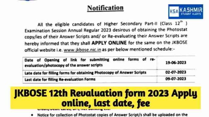 JKBOSE 12th Revaluation form 2023, Apply online, fee last date