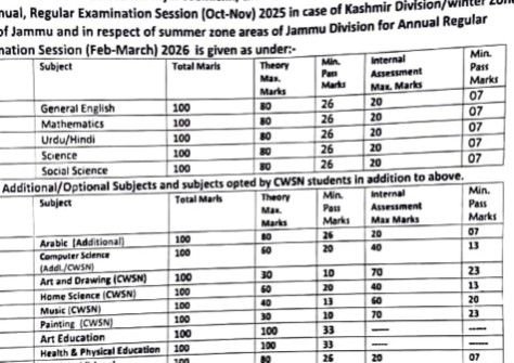 The Jammu and Kashmir Board of School Education (JKBOSE) has officially released the updated Marks Distribution and Passing Criteria for Class 10 Examination 2025-26. This detailed notice outlines the maximum and minimum pass marks, assessment structure, and evaluation methods for both regular and vocational subjects.