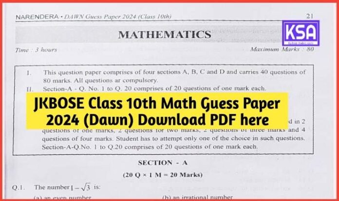 JKBOSE Class 10th Math Guess Paper 2024 (Dawn) Download PDF here