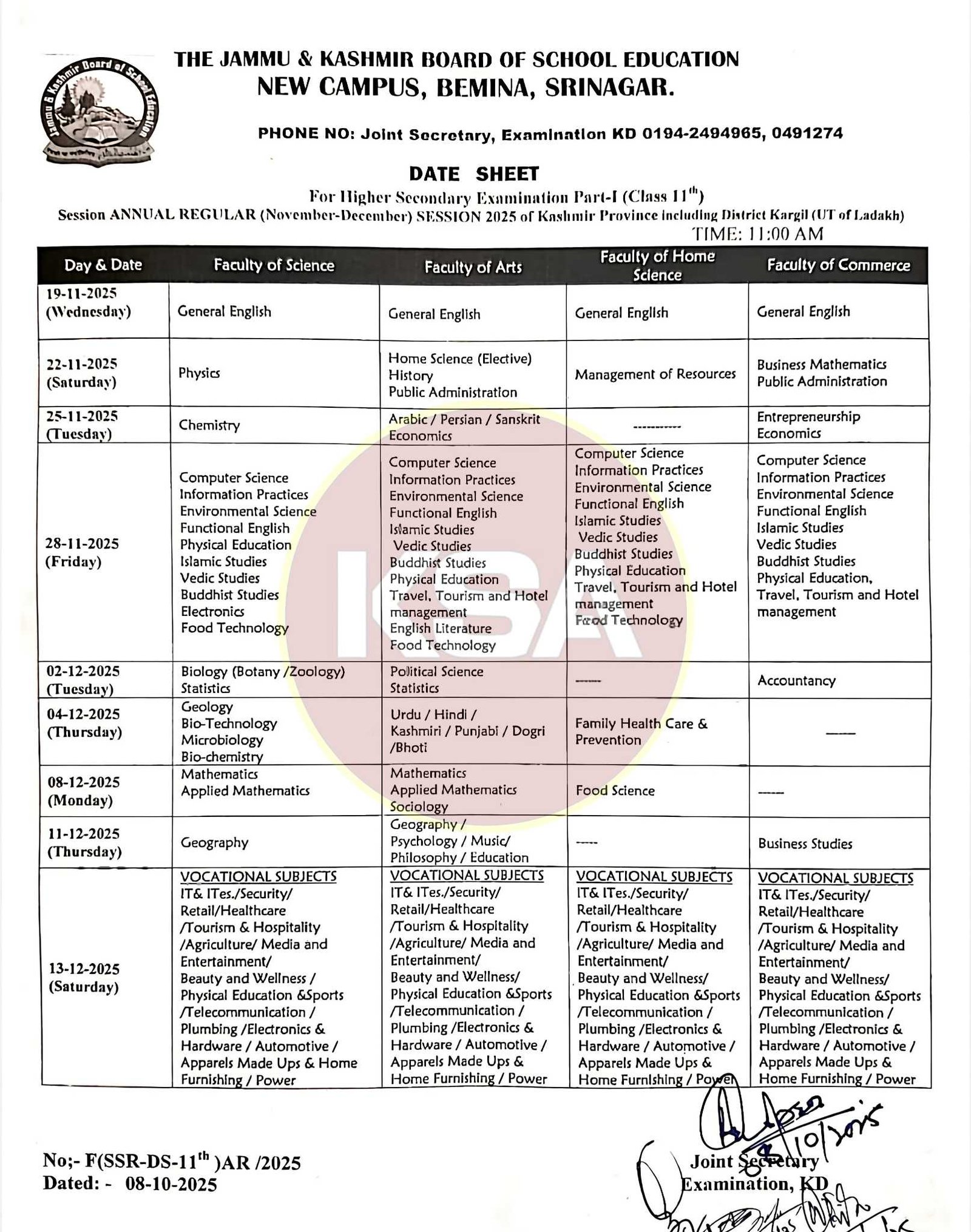 The Jammu and Kashmir Board of School Education (JKBOSE) has officially released the Date Sheet for Class 11th Annual Regular Examination 2025 (November–December Session) for Kashmir Province, including District Kargil (UT of Ladakh). The examination will begin on 19th November 2025 and conclude on 13th December 2025.