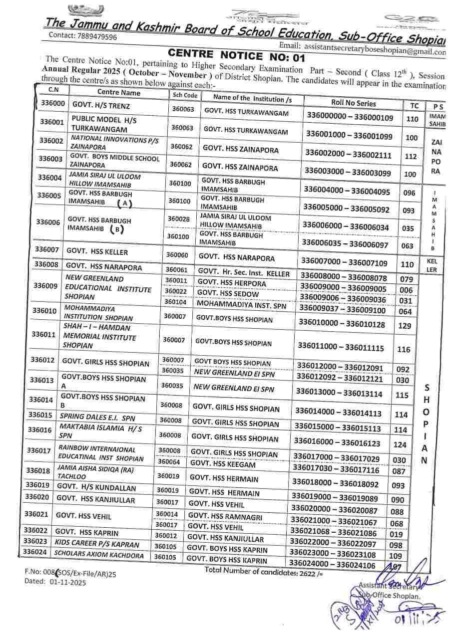 The Jammu and Kashmir Board of School Education (JKBOSE) has officially released the Centre Notice No. 01 for the Higher Secondary Examination Part-II (Class 12th), Annual Regular 2025 (October–November Session) for District Shopian. This notice provides detailed information regarding the examination centres, roll number series, and assigned school venues for students appearing in the 12th Class Board Exams.