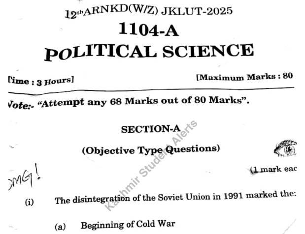 The JKBOSE Class 12th Political Science exam followed the latest model paper pattern: