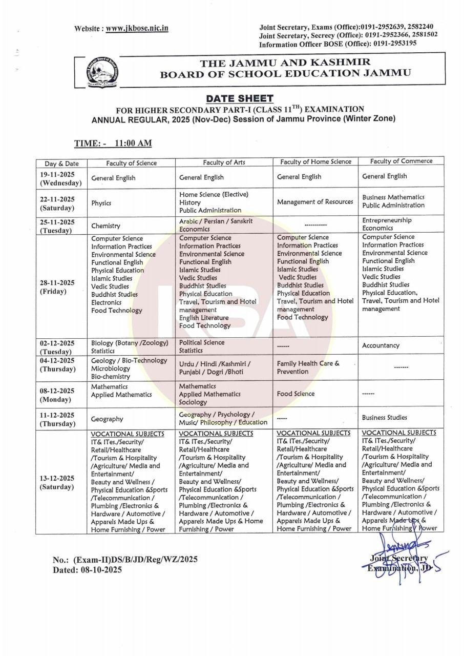 The Jammu and Kashmir Board of School Education (JKBOSE) has officially released the date sheet for the Class 11th Annual Regular Examinations 2025 for students of the Jammu Province (Winter Zone). According to the notification dated October 8, 2025, the examinations are scheduled to commence from November 19, 2025, and will continue until December 13, 2025.