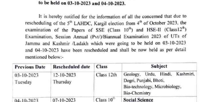 It is hereby notified for the information of all the concerned that due to rescheduling of the 5th LAHDC, Kargil election from 4th of October 2023, the examination of the Papers of SSE (Class 10) and HSE-II (Class 12th) Examination, Session Annual (Pvt/)/Biannual Examination 2023 of UTS of Jammu and Kashmir /Ladakh which were going to be held on 03-10-2023 and 04-10-2023 have been rescheduled and shall be now held as per detail mentioned below:-