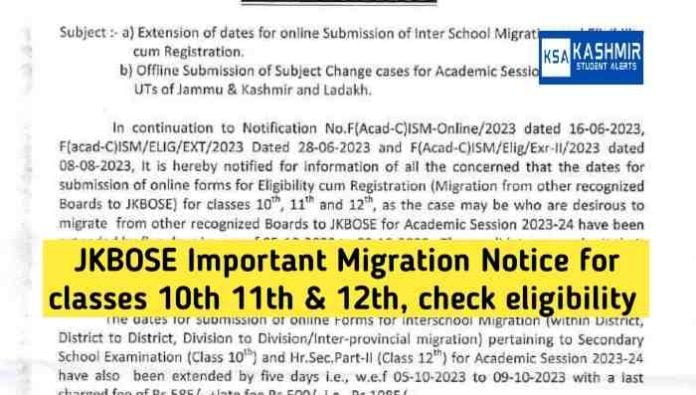In continuation to Notification No.F(Acad-C)ISM-Online/2023 dated 16-06-2023, F(acad-C)ISM/ELIG/EXT/2023 Dated 28-06-2023 and F(Acad-C)ISM/Elig/Exr-11/2023 dated 08-08-2023, it is hereby notified for information of all the concerned that the dates for submission of online forms for Eligibility cum Registration (Migration from other recognized Boards to JKBOSE) for classes 10th, 11th and 12th, as the case may be who are desirous to migrate from other recognized Boards to JKBOSE for Academic Session 2023-24 have been extended by five days l.e., w.e.f 05-10-2023 to 09-10-2023. The candidates can submit their online Eligibility Forms with a last charged fee of Rs.1415/- + late fee of Rs.500/- per candidate i.e., total of Rs.1915/-.