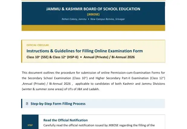The Jammu & Kashmir Board of School Education (JKBOSE) has officially issued detailed instructions and guidelines for filling the Online Examination Form for Class 10th (Secondary School Examination – SSE) and Class 12th (Higher Secondary Part-II – HSP-II) for Annual (Private) / Bi-Annual 2026 examinations. This notification is applicable to students of both Kashmir Division and Jammu Division, including summer zone and winter zone areas of the Union Territories of Jammu & Kashmir and Ladakh.
