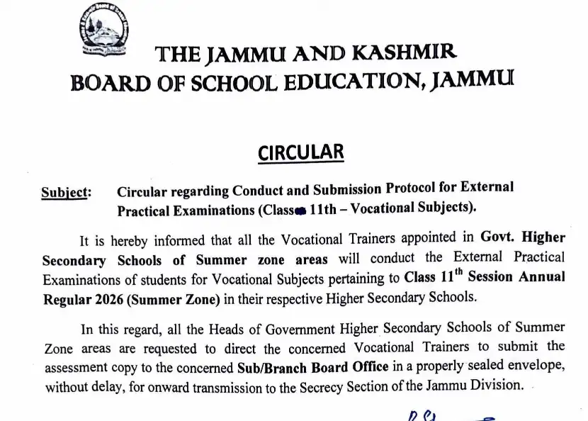 The Jammu and Kashmir Board of School Education (JKBOSE) has released an important circular regarding the conduct and submission protocol for External Practical Examinations of Class 11 Vocational Subjects (Session Annual Regular 2026 – Summer Zone). This notification is crucial for students, vocational trainers, and school authorities across the Jammu division.