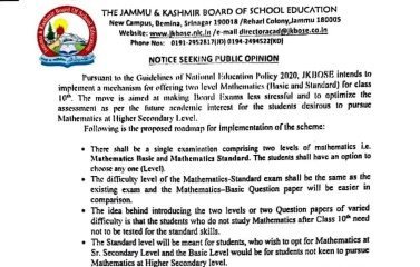 In the meantime, Director Academics of JKBOSE in a notification seeking public opinion has said that as per the Guidelines of National Education Policy 2020, JKBOSE intends to implement a mechanism for offering two level Mathematics ‘Basic and Standard’ for class 10th.