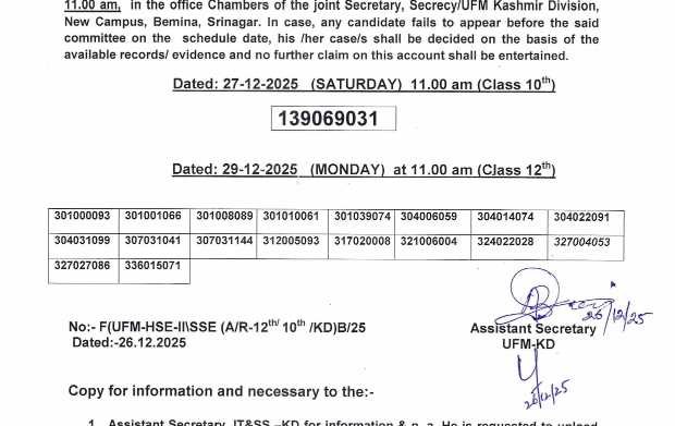 The Jammu and Kashmir Board of School Education (JKBOSE) has issued Notification-II regarding the appearance of candidates before the Unfair Means (UFM) Committee for the Secondary School Examination (SSE) Class 10th and Higher Secondary Examination (HSE) Part-II Class 12th Annual/Regular Session 2025 (Oct–Nov) for the Kashmir Division.