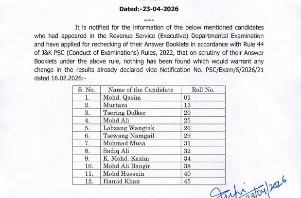 As per the official notice dated 23 April 2026, JKPSC has informed candidates that the rechecking process has been completed for those who had requested verification under Rule 44 of the J&K PSC (Conduct of Examinations) Rules, 2022.