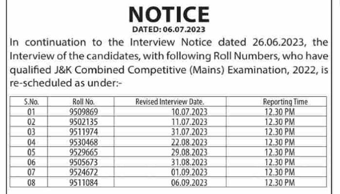 Subject: Interview for the candidates who have qualified J&K Combined Competitive (Mains) Examination, 2022- Re-scheduling
