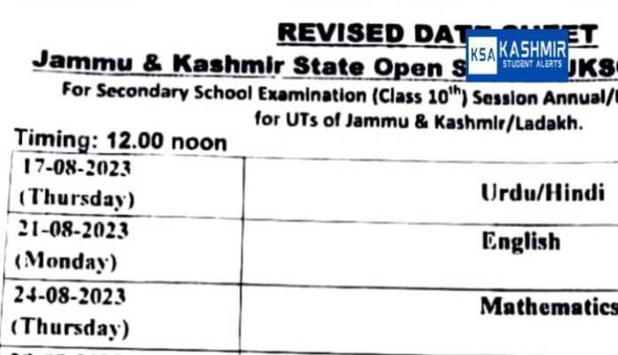 REVISED DATE SHEET FOR Jammu & Kashmir State Open School (JKSOS) Class 10th For Secondary School Examination (Class 10th) Session Annual/B-annual 2021-22 for UTs of Jammu & Kashmir/Ladakh.